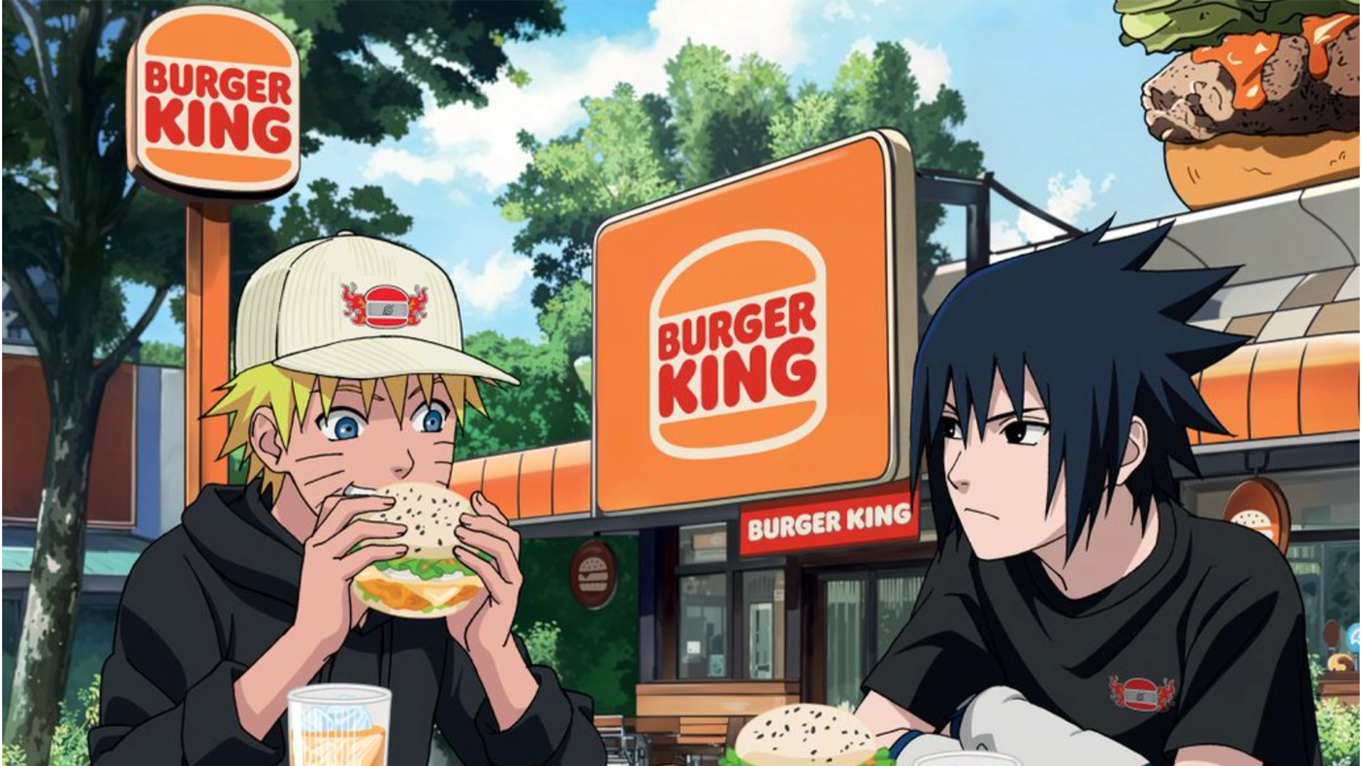Notre concept était l’ouverture d’un restaurant Burger King dans le village de Naruto, à « Konoha ». À partir de cette idée, nous avons imaginé différents visuels illustrant Naruto et Sasuke dégustant un burger, réalisés ensuite par les illustrateurs officiels de la saga. Nous avons également créé le logo de la collaboration